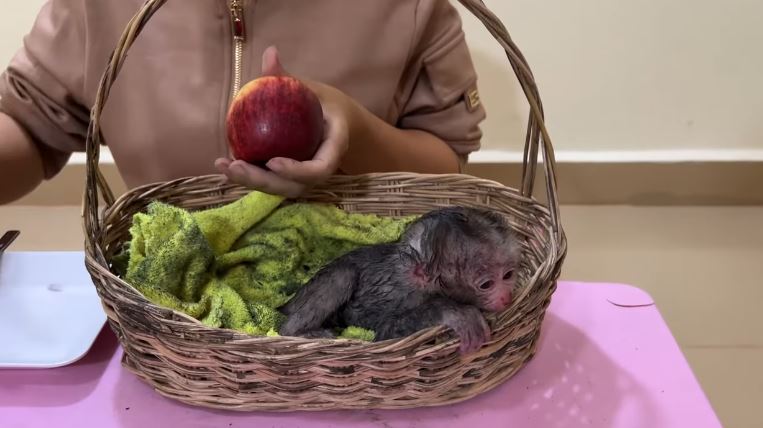 I couldn’t stop my tears the moment I saw Mom gently sitting on the floor, holding her tiny newborn close. The little monkey was so small, fragile, and innocent, clinging softly to Mom’s warm chest. In that quiet moment, the world seemed to slow down. Mom prepared a small spoon of mashed fruit, carefully choosing the softest pieces so her newborn could eat without fear. Every movement was full of patience, love, and deep care that only a mother can give.