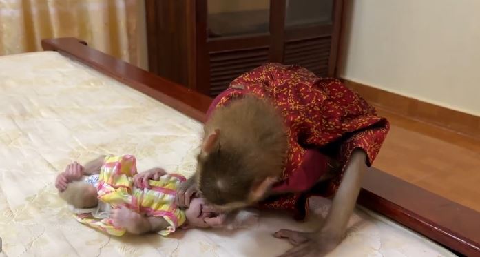 Jenny stood nearby, her expression dark and tense. She looked annoyed that Chichi had taken Mom’s lap first. Jenny stepped closer with angry eyes, making Chichi scream even louder. The sound was full of protest, jealousy, and fear. Chichi didn’t want to share Mom, not now, not when she felt threatened. Her small body leaned forward aggressively, clearly showing she was ready to fight if Jenny came any closer.