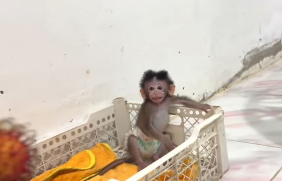 When I first placed the rambutan on the floor, the monkeys froze. Cici stared at it like it was a dangerous creature ready to attack. She slowly leaned forward, sniffed once, then jumped backward so fast she nearly fell over. Her eyes were wide, her tiny hands shaking — you could tell she was thinking, “Why does the fruit have hair?!”