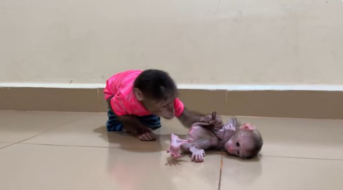It was a quiet morning filled with soft sunlight when Pavpav decided it was time to care for the baby monkey. There was no anger, no fear—only instinct, patience, and love. As the baby wriggled playfully, Pavpav gently dragged the little one upside down to the cool floor, preparing for a careful grooming session. To an outsider it might look surprising, but in the monkey world, this was a moment of trust and blessing.