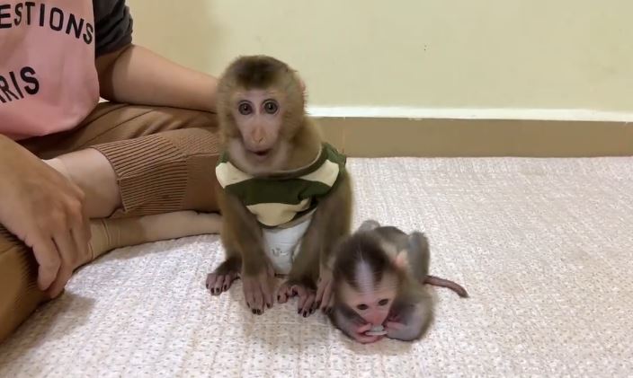 Early in the quiet morning at Cute Monkey Home, little Linda was enjoying her peaceful moment on the soft mat near Mom. Her tiny hands hugged her favorite pacifier tightly, sucking calmly while her big eyes slowly blinked. Everything felt safe and warm. Mom was busy nearby, and Linda believed no one would disturb her precious comfort.