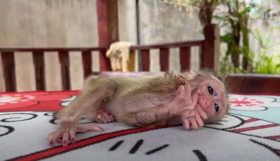 Under the warm and peaceful sunlight of the afternoon, the little newborn baby monkey prepared for his sweet noon nap. His tiny body lay gently on a soft blanket, his innocent eyes half open, and his mouth slowly began to stretch. It was that adorable and dramatic moment—a huge, slow-motion yawn that melted every heart watching. The tiny pink tongue and small hands reaching upward made the yawning scene look like a performance of pure innocence and charm.