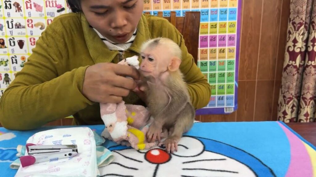 Mom quickly cleaned him, even while he tried to roll away. She held him gently but firmly, knowing that this was just one of TanTan’s spoiled moments. When she finally placed the fresh new diaper on him, TanTan’s c-rying slowed down, turning into soft whimpers. Mom stroked his head and whispered, “It’s okay, my boy. All done.”