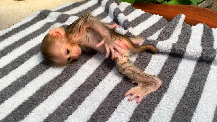 After the shower, the caregiver wrapped him in a warm towel. The baby monkey looked fluffy, clean, and very satisfied. No more itching! Now he was ready to play again, feeling fresh and joyful.